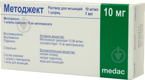 - 1 мл (1 шприц) містить: активні речовини: метотрексат динатрію 10,96 мг (16,44 мг), що відповідає змісту метотрексату 10 мг (15 мг)