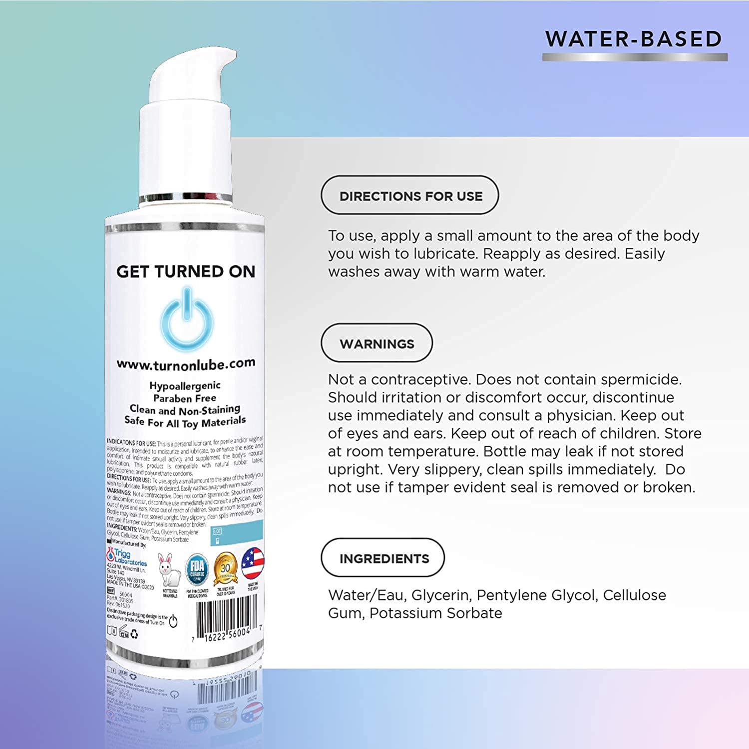 Чистота та простота: Turn On Water-Based легко змивається, не залишає плям і не залишає небажаних слідів, таких як інші мастила, які ви могли використовувати. Зволожуюча формула: мастило Turn On на водній основі спеціально розроблене для зволоження та омолодження шкіри під час використання. Безпечний для презервативів і підходить для іграшок: формула Turn On протестована третьою стороною та доведена її сумісність із презервативами з натурального каучуку, поліізопрену та поліуретану. Змащення Turn On на водній основі безпечне для використання з усіма поширеними іграшковими матеріалами. Гіпоалергенність: формула Turn On без парабенів гіпоалергенна і не містить нафтохімічних речовин, гормонів та ароматизаторів. Непомітне та елегантне пакування: всі продукти упаковані без маркування зовні. Усі пляшки мають чистий, витончений вигляд без зображень, орієнтованих на дорослих, які можуть привернути небажану увагу. Зовнішній вигляд пляшки було оновлено, але це мастило, як і раніше, містить ті ж високоякісні інгредієнти преміум-класу, що й раніше. Склад: Water/Eau, Plant-Based Glycerin, Pentylene Glycol, Cellulose Gum, Potassium Sorbate.